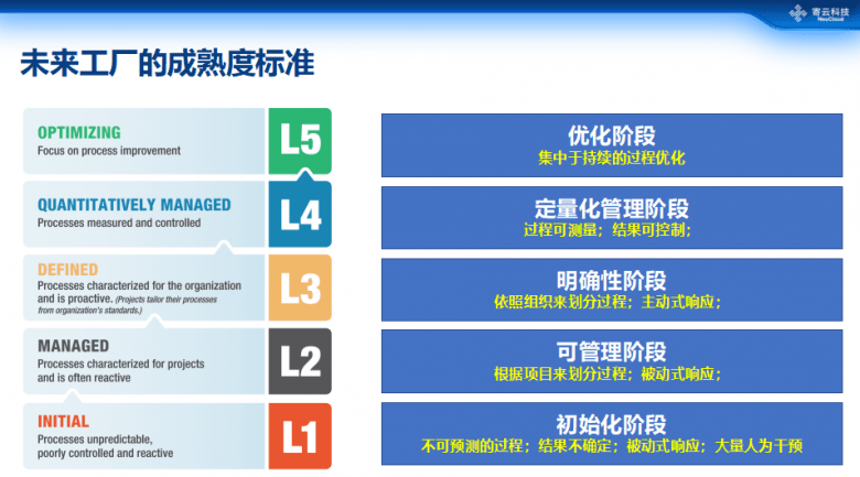 工业数字化转型是通向未来工厂的交通工具。未来工厂的成熟度标准,可以通过初始化阶段、可管理阶段、明确性阶段、定量化管理阶段、优化阶段等五个成熟度标准为工业企业对自身的数字化进程提供一个有据可循的科学体系。第一,初始化阶段需要人为大量干预,过程不可预测且结果不确定,被动式响应;第二,可管理阶段,需要根据项目来划分过程,同样是被动式响应;第三,明确性阶段,是依照组织来划分过程,能进行主动式响应;第四,定量化管理阶段,过程能够测量、结果也是能控制的;第五,优化阶段,集中于持续的过程优化。