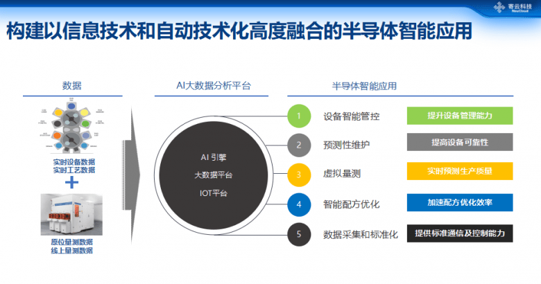 时博士指出,针对于类似半导体的这类复杂性高端制造行业的数字化转型,构建以信息技术和自动化技术来构建IT和OT 高度融合的半导体智能化应用至关重要。即从设备端的海量、多样性数据中获取到关键的、可用的数据,通过大数据、物联网和人工智能的数据分析,构建一系列半导体行业的智能应用,提升设备管理能力、可靠性、帮助实时预测生产质量、加速配方优化效率以及提供标准通信及控制能力。