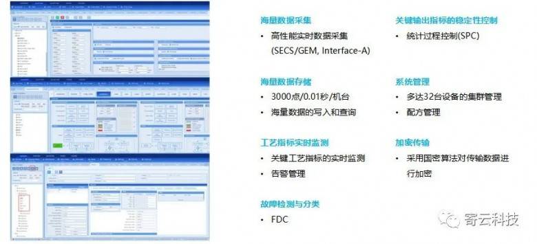 基于寄云工业物联网平台和工业大数据平台,为多种半导体装备提供设备状态管理,设备监控,设备告警,配方管理,制程管理,制程分析等应用,帮助实现了3000点/秒/机台海量数据的写入和查询,关键工艺指标的实时监测,多台设备的集群管理,以及故障检测与分类、关键输出指标的稳定性控制等。