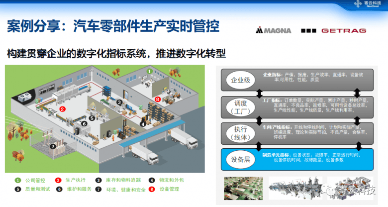 在汽车零配件行业,寄云科技与全球500强企业麦格纳集团下属格特拉克针对生产设备运行效率的优化展开合作,依托寄云科技NeuSeer工业互联网平台,通过采集设备实时状态数据,结合ERP和MES的工艺数据,实现秒级的生产指标的实时计算,构建工艺流程监控、关键指标监控,覆盖设备端、工厂层、产线层到集团层等不同层面的指标,打通MES、ERP等OT/IT系统和应用,最终帮助客户实现产线所需人员减少,OEE(设备综合效率)提升9%,MTBF(平均无故障工作时间)增加6%等可量化的可观收益。