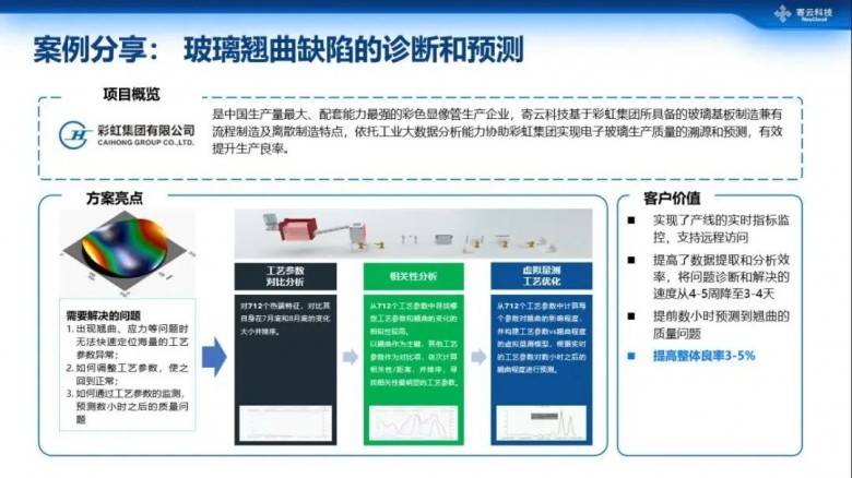 时博士结合中国生产量最大、配套能力最强的彩色显像管生产企业彩虹集团的案例,讲述寄云科技如何基于彩虹集团所具备的玻璃基板制造兼有流程制造及离散制造特点,依托工业大数据分析能力协助彩虹集团实现电子玻璃生产质量的溯源和预测,实现了产线的实时指标监控,提高了数据提取和分析效率,将问题诊断和解决的速度从4-5周降至3-4天,提高整体良率3%~5%。