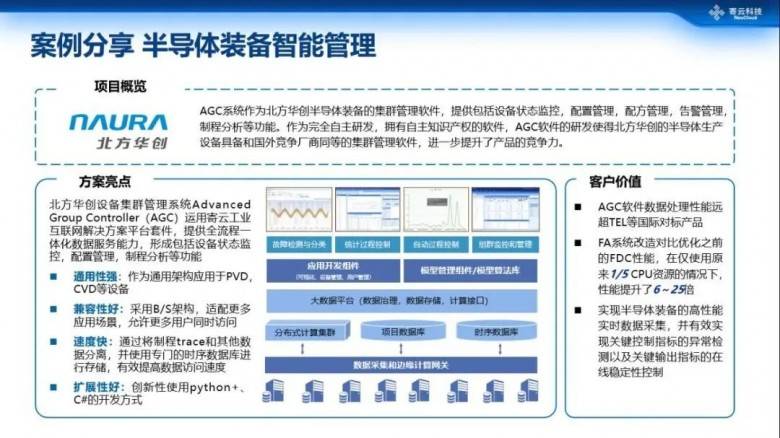 时博士以北方华创设备集群管理系统Group Controller(AGC)为例,讲述了该系统如何运用寄云工业互联网解决方案平台套件,提供全流程一体化数据服务能力,形成包括设备状态监控、配置管理、制程分析等功能,具有通用性强、兼容性好、速度快、扩展性好的优势,大幅提升了系统的数据处理性能,在仅使用原来1/5 CPU资源的情况下,性能提升了6~25倍,为客户创造价值。