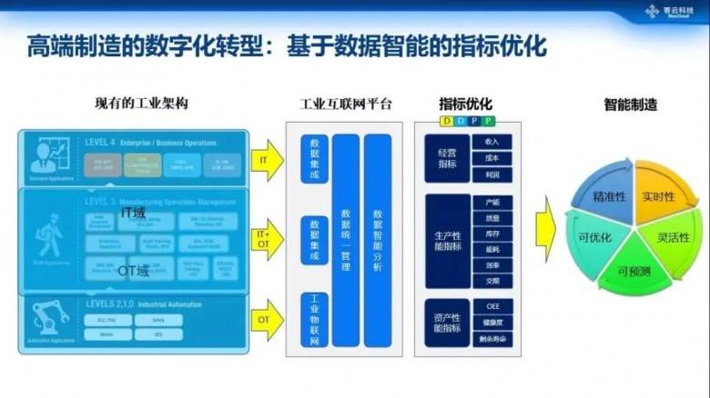面对以上五大难题,时博士首先指出高端制造的数字化转型是基于数据智能的指标优化,具体分为经营指标优化、生产指标优化和设备性能指标优化。通过构建工业互联网平台的方式,把不同的IT和OT数据充分融合,在数据平台上构建起来一系列指标优化的能力。当然了,这个指标不仅包含底层设备的可靠性指标,OEE指标等,还要包括生产过程中的产能、质量效率,以及企业的经营指标。 所有指标的优化都基于对不同领域、不同部门、不同环节的数据集成和分析,进而满足上述提到的高端制造精准性强、实时性高、灵活性大、可预测、可优化的要求。