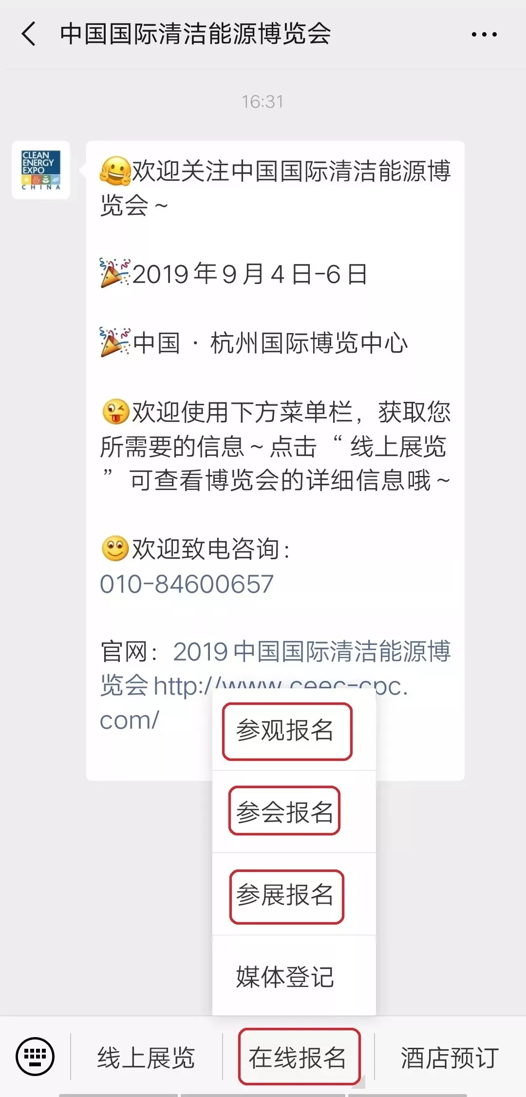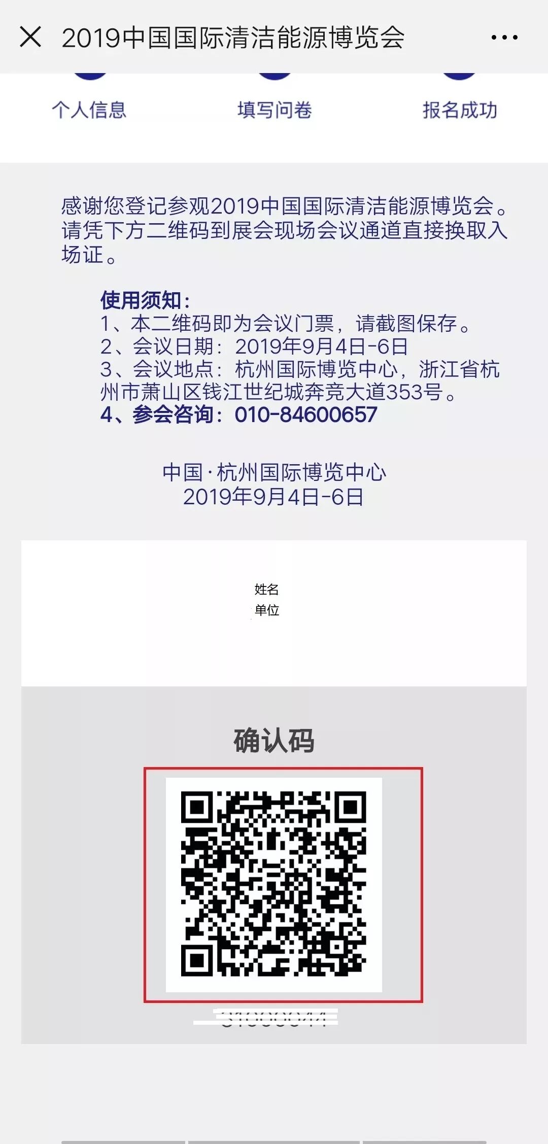点击底部菜单栏“在线报名”,根据需求选择“参观报名”“参会报名”,依据网页提示完成信息填写,生成二维码电子门票。