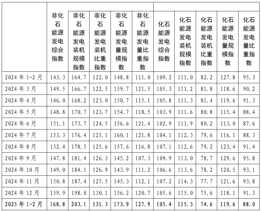 1-2月非化石能源发电装机规模指数为203.1,“十四五”以来非化石能源发电装机规模累计增长了103.1%,年均增长15.2%,同比增长23.3%;非化石能源发电装机比重指数为131.3,“十四五”以来非化石能源发电装机比重累计增长了31.3%(比重从2020年底的44.8%提高至2025年2月底的58.8%)。其中,1-2月新能源发电装机规模指数为266.1,“十四五”以来新能源发电装机规模累计增长了166.1%,同比增长31.4%;新能源发电装机比重指数为172.1,“十四五”以来新能源发电装机比重累计增长了72.1%(比重从2020年底的25.7%提高至2025年2月底的44.2%)。